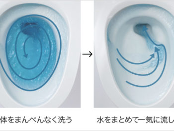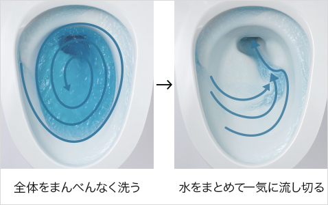 ◆ スパイラル水流:水流をコントロールする形状で、少ない水量で高い洗浄力