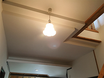 2階のトイレを移動したことで下がった天井は、段加工することでおしゃれに変身。