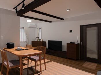 補強梁はクロスで巻き、既存の梁は塗装で化粧直し。白い壁に黒い梁がよく映えます。
