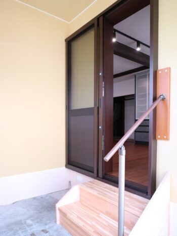 キッチン横の勝手口は、骨組みだけだった内装を石膏ボードで仕上げ、基礎部分はベニヤを張り隙間を塞ぎました。又、階段と手すりを設けたことで、安全に出入りできるようになりました。